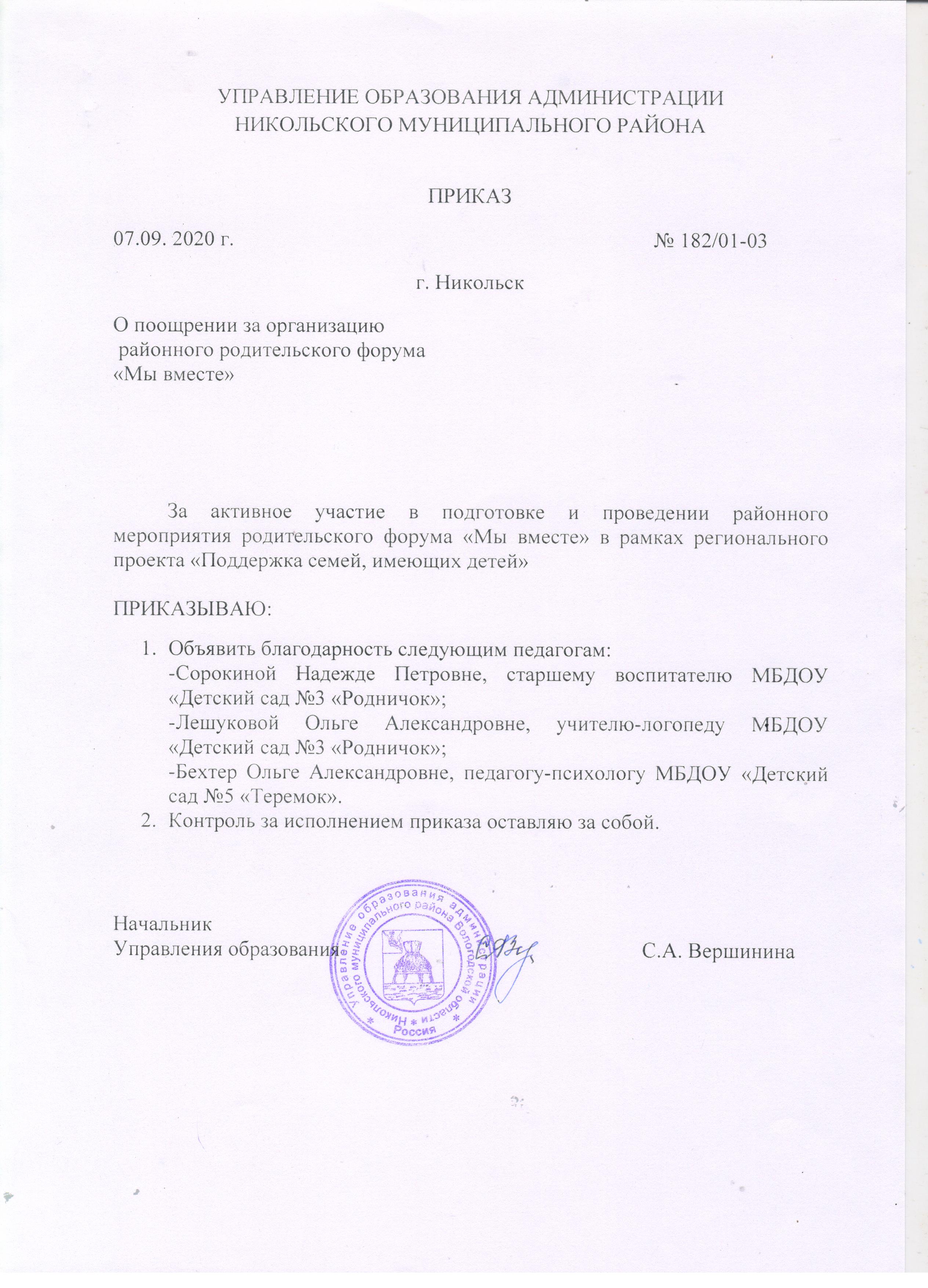 Приказ УО №182/01-03 от 07.09.2020г. "О поощрении за организацию районного родительского форума "Мы вместе"
