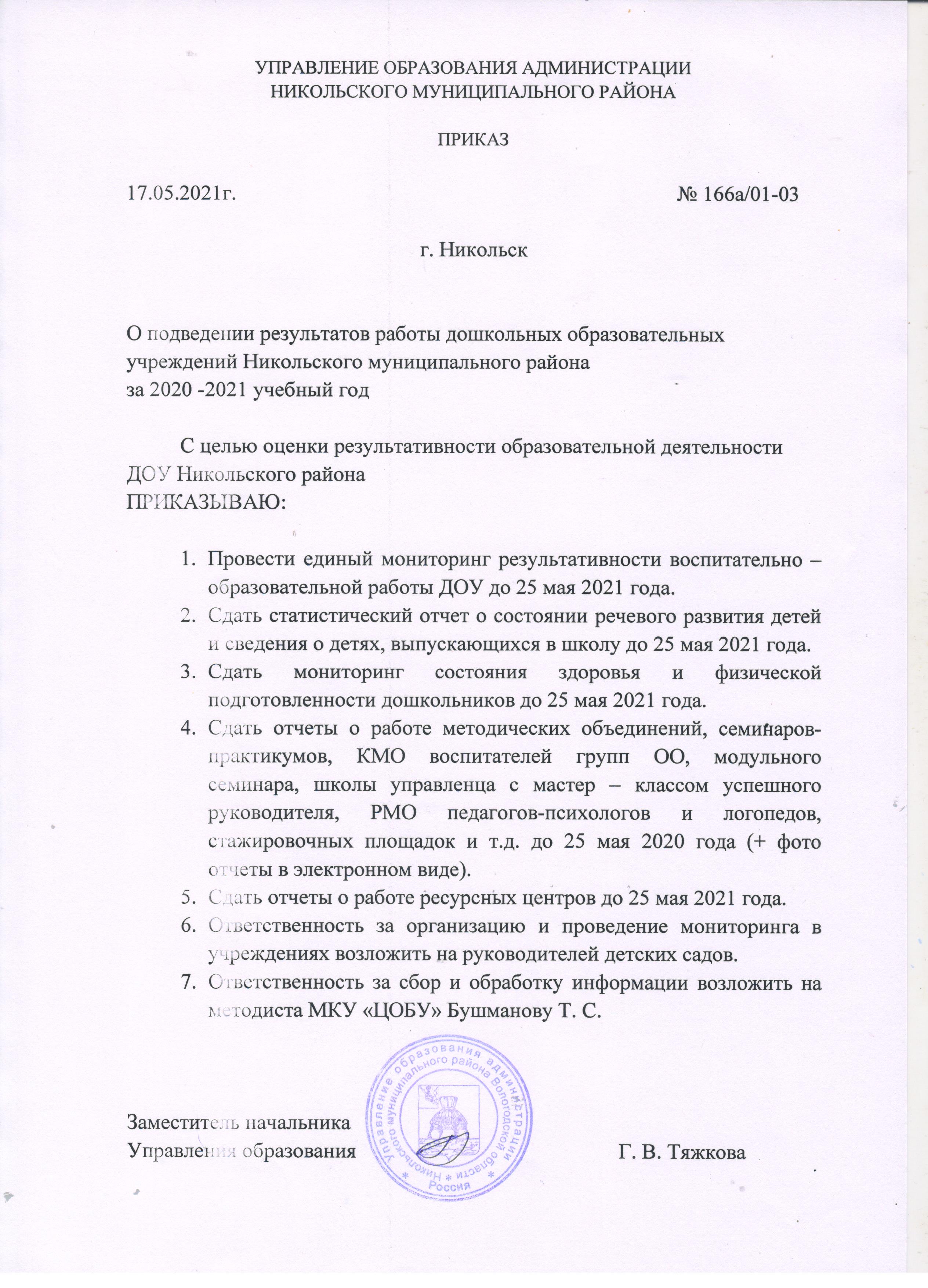 Приказ УО №166а/01-03 от 17.05.2021г "О подведении результатов работы ДОУ Никольского муниципального района за 2020-2021 учебный год"