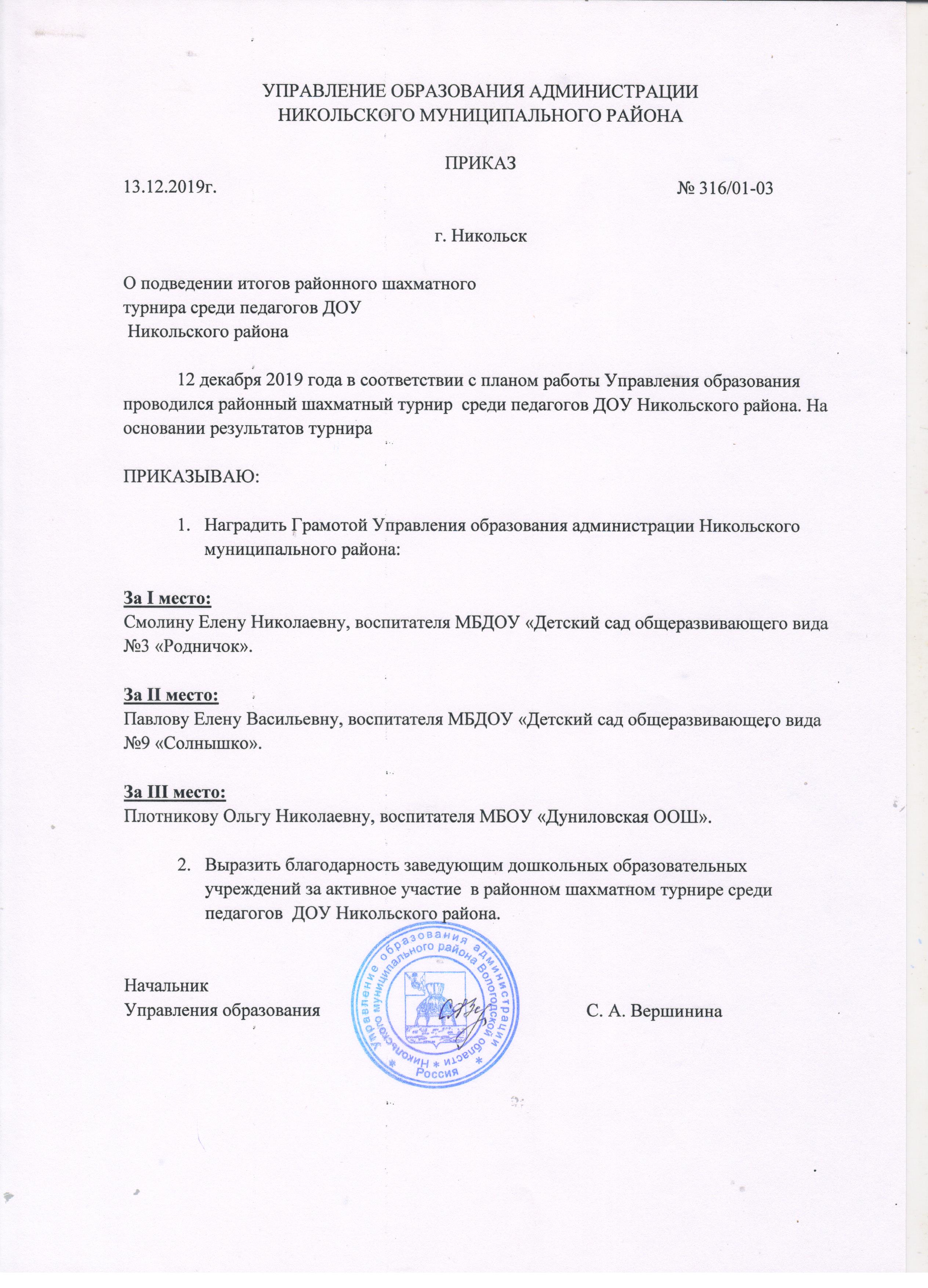Приказ УО №316/01-03 от 13.12.2019г. "О подведении итогов районного шахматного турнира среди педагогов ДОУ Никольского района"